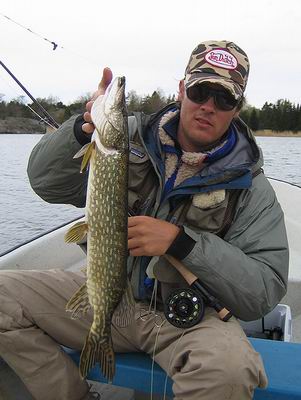Gesagt, getan und so erreichten wir nach Anfahrt über Rostock - Fähre – Trelleborg -.....Risö – unsere kleine Insel. Die schwedischen Schärengärten sind 10.000 kleine Inseln verteilt im Brackwassergebiet der Ostsee. Im leicht salzhaltigen Wasser kommen im Frühjahr die großen Heringsschwärme, um hier zu laichen. Das ist auch der Zeitpunkt, wenn sich die Hechte nach dem Laichgeschäft auf diese leckeren Happen stürzen. Wir hatten 7er und 8er Ruten im Gepäck, die mit Schwimmschnüren oder noch besser mit einer langsam sinkenden clear-Tip bestückt waren. Als Streamer geht alles, was schön buschig ist und sich gut werfen lässt. Meine gesamte Salzwasserkollektion, die ich mal für Kuba gekauft hatte kam zum Einsatz. Aber auch Reste der Alaska Lachsstreamer brachten Fisch. Generell ist zu sagen, dass helle Muster etwas fängiger waren. Weiß und Silber nicht zu überdimensioniert. Ein präziser Wurf ist nämlich Pflicht, doch dazu später. |