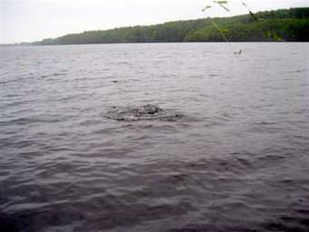 2 - 4 m tiefe Bereiche mit Bewuchs (glänzendes Laichkraut - bis an die Oberfläche). Diese Stellen findet man meistens im Freiwasser. |