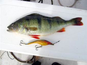 | Dann wird mit dem Wobbler, sozusagen als "Teaser", das Wasser abgesucht ob die Brüder tatsächlich nicht vor Ort sind oder nur nicht auf Streamer beißen wollen. Sehr häufig ergaben die ersten Wobblerversuche bereits einen Treffer und das waren oftmals nicht gerade die Kleinsten. Warum sie an manchen Tagen den Streamer ablehnen, konnte ich bisher noch nicht ergründen. Man möge mir also nachsehen, irgendwie gehört der Wobbler an diesem See dazu. Den Barschen stelle ich jedoch, ohne Ausnahme, nur mit der Fliegenrute nach. Der lebende Köderfisch ist erlaubt aber nach meinem Dafürhalten nicht erforderlich, da beim Blinkern, bzw. Schleppen sehr gute Ergebnisse zu erzielen sind. | ![]() |
