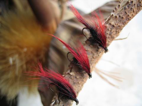 Fliegen: Da die Hornhechte nach meiner Erfahrung sehr anspruchslos in der Köderwahl sind, verwende ich einfache Fliegen der Größe 10 bis 14 in den Farben orange bzw. rot. |