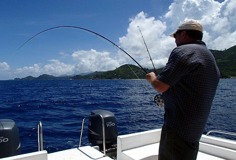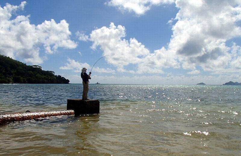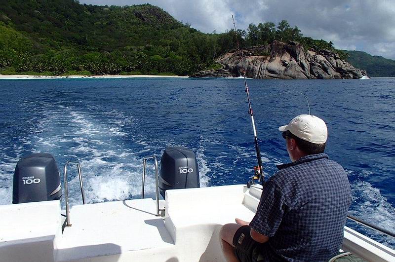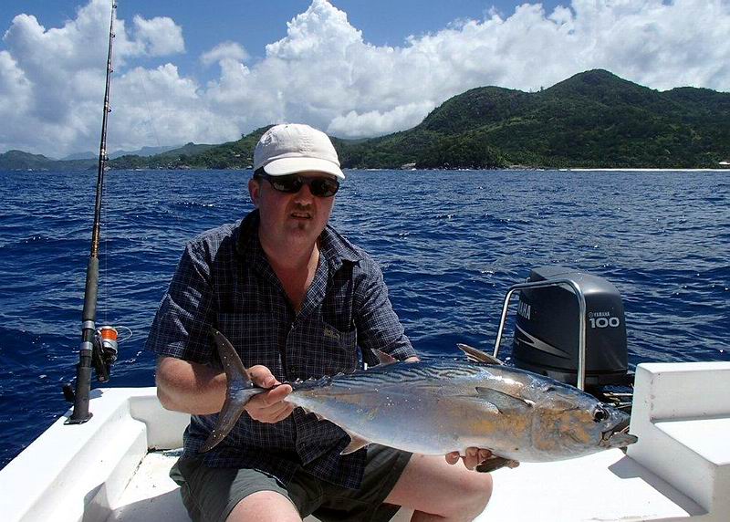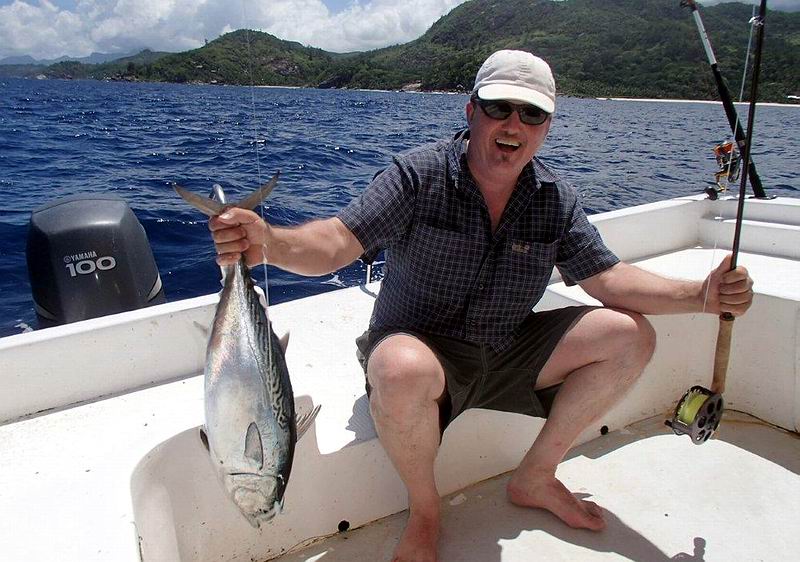 | Am Donnerstag fuhren wir wieder mit dem Boot hinaus. Nach den üblichen Vorbereitungen schipperten wir vorbei an wunderschönen Stränden zum südlichsten Punkt der Seychellen. Herbert bestückte seine Schleppruten mit seiner Geheimwaffe und ich richtete meine 9er Rute mit einer Hornhecht-Imitation her. Immer auf der Suche nach kreisenden Seevögeln stellt sich bald der Erfolg ein. Es kamen erste Bisse auf Herberts Schleppruten und schnell hatten wir 3 beachtliche Bonitos an Bord. Mit einer Tintenfisch-Imitation an meinem Stahlvorfach gelang mir der Fang meines ersten Bonitos und kurz darauf fing ich einen Galate (rainbow-runner) ebenfalls mit der Fliegenrute. Zu Herberts besonderer Freude gelang es uns, noch drei Yellowfine Tuna zu fangen. Die Zeit verging wie im Flug und auf der Heimfahrt konnten wir noch einige Bonitos fangen. |