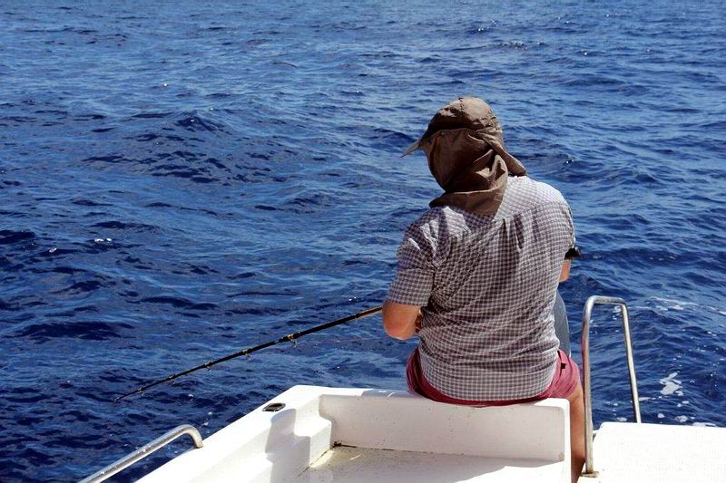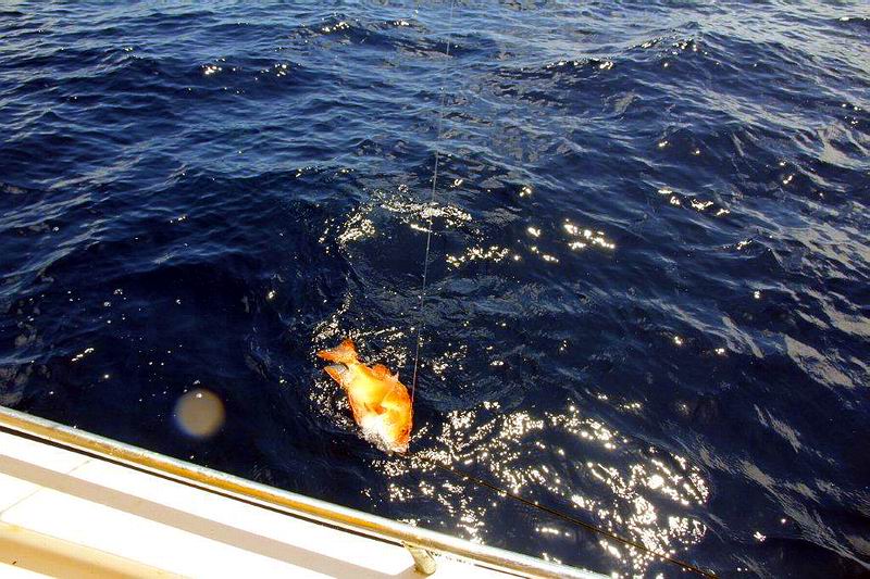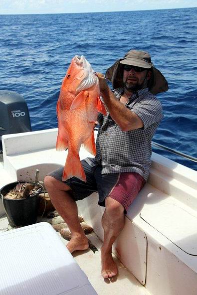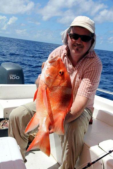 | Dienstag frühmorgens, gleich nach dem Aufstehen, sah ich vor dem Haus eine grüne Heuschrecke, die auf den Seychellen als Glücksbringer gilt. An diesem Tag wollten wir mit dem Boot zum Grundfischen ausfahren. Wir mussten Eis für die Behälter holen, das Boot auftanken und unsere Ausrüstung an Bord bringen. Wir sind ca. 20 bis 25 Kilometer rausgefahren und haben dann bestimmt bei Superwetter 6 bis 7 Stellungswechsel (Ankerplätze) gemacht. Andrè, unser einheimischer Begleiter, fischte traditionell mit der Handleine. Wir fischten mit der Spinnrute. Bis zum späten Nachmittag füllte sich unsere Fischbox mit Red Snapper (captain rouge) und verschiedenen anderen Barschen wie brownspottet grouper (vye makonde) und redbanded grouper (vye rouge). Für André und seine Verwandtschaft waren für einige Zeit die Mahlzeiten gesichert. Damit ging wieder ein sehr schöner, jedoch anstrengender Tag erfolgreich zu Ende. |