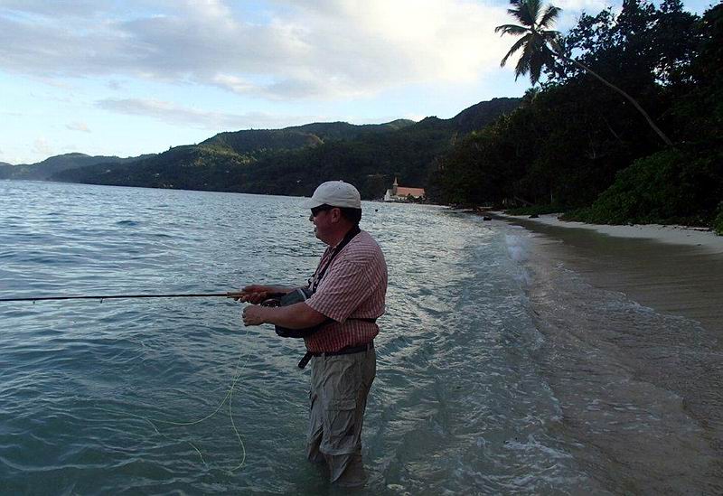 Montag, um 6.45 Uhr nach den Einreiseformalitäten wurde ich von meinem Freund am Flughafen abgeholt. Wir fuhren nach Takamaka zu seinem Haus und nach einer stärkenden Brotzeit ruhte ich mich bis Mittag aus. Gegen 14.00 Uhr sind wir an den Strand gefahren, an dem Herbert ein, zwei Tage zuvor Sardinenschwärme ausgemacht hatte und wir versuchten dort unser Glück. Nach einer guten halben Stunde spritzte das Wasser keine 15 Meter vom Strand entfernt auf. Mit einem kurzen Wurf präsentierte ich meinen selbstgebunden „grünen Clouser“ und mein erster „Giant Trevally“ zog wie verrückt an meiner 9er RPL+. Nach etlichen Fluchten konnte ich ihn landen und nach einem kurzen Fotoshooting schenkte ich ihm die Freiheit wieder. Kurz danach fing Herbert noch einen Sabe (Queenfish) mit der Fliegenrute. Da sich nach dem Drill mit dem Giant Trevally die Schrauben am Rollenfuß meiner Lamson gelöst hatten, fuhr Herbert mit dieser zurück, um sie zu reparieren und um eine kräftige Spinnrute zu holen. Bis zum Abend fischten wir zwar ohne Erfolg weiter aber für mich war dies ein perfekter Einstieg in eine wunderbare Fischerwoche. |