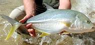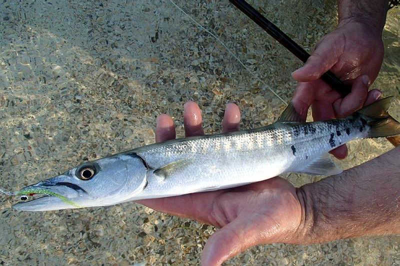 | Am Freitag stand Flatfischen auf dem Programm. Wir fischten erst ab gegen 13.00 Uhr, bei ablaufendem Wasser in einem Flat, in dem Herbert schon öfter Bonefish gesehen und auch gefangen hat. Ich wollte es mit einer meiner selbstgebundenen „Gotcha-Fliegen“ versuchen. Aber leider hatten wir keinen Biss. Nach einer Pause versuchten wir es erneut, diesmal bei auflaufendem Wasser. Obwohl wir bestimmt 250 bis 300 Meter das Flat hinausfischten hatten wir auch diesmal kein Glück – und so machten wir ganz zum Schluss noch ein paar Würfe vom Ufer aus und jeder von uns konnte noch mit einem Lächeln im Gesicht einen kleinen Barracuda landen und dann releasen. | ![]() |