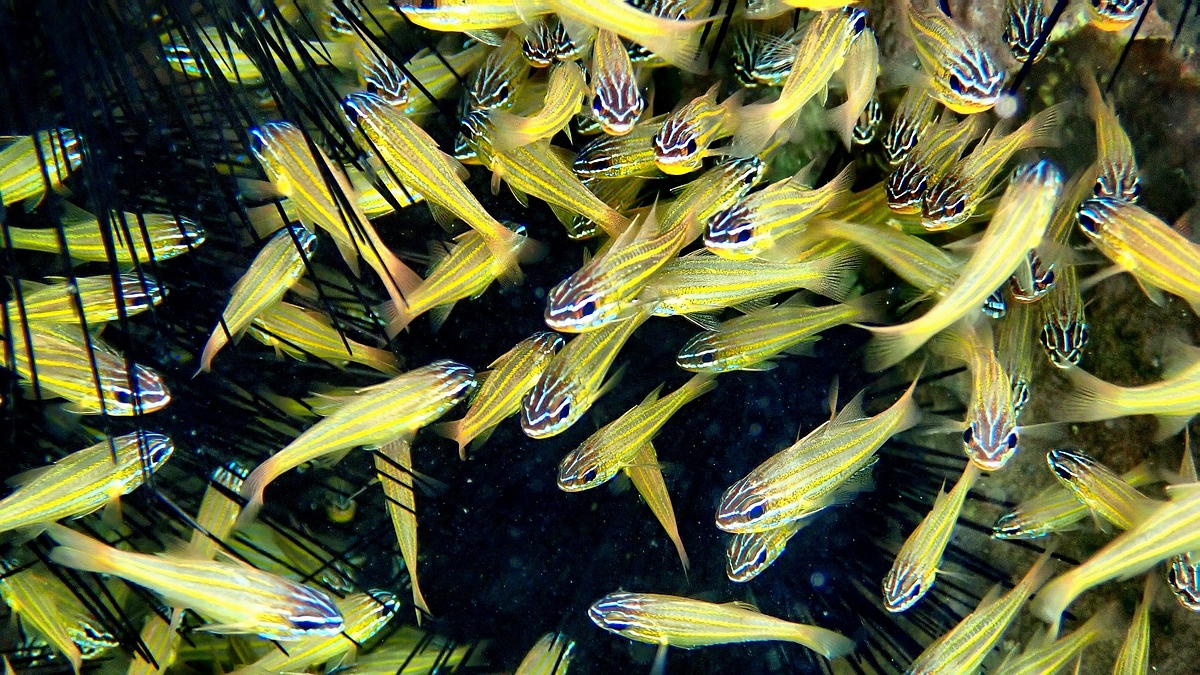 Schwarm Kardinalbarsche Schutz zwischen den Seeigel-Stacheln