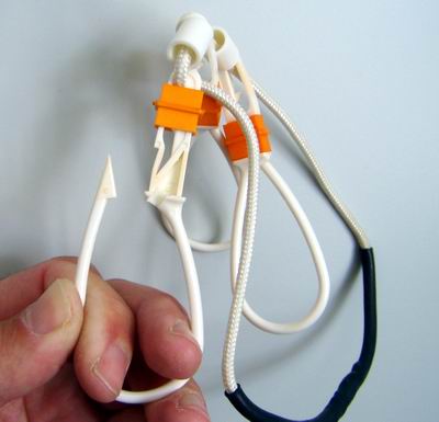 "Fischträger / Stringer" aus dem Programm von Martin Rau Ebenfalls ein sehr nützliches Utensil, vor allem - aber nicht nur - für die Meerforellenfischerei hervorragend geeignet: der Stringer! Dieser lässt sich in den Watgurt einhängen und ermöglicht das einzelne und sehr sichere Befestigen und Transportieren von bis zu drei versorgten Fischen. Die Haken des Stringers werden durch die Kiemendeckel des Fisches ein- und durch das Maul wieder ausgeführt und danach verschlossen. Mit dem Fischträger erspart man sich den oft langen Rückweg an den Strand (wo meist auf die Schnelle sowieso kein passendes Stück Schnur zu finden ist...) zum Versorgen des Fisches und kann gleich vor Ort weiterfischen, denn: eine Meerforelle kommt ja oftmals nicht allein! Aufbau und Funktionsweise sind einfach und in der von Martin Rau gewohnten Weise ausgereift: Grundlage ist ein stabiles Nylonseil (Stärke 3,5 mm) von etwa 40 cm Länge, zum Ring verklebt und mittels Schrumpfschlauch gesichert. Auf diesem Seil sitzen, durch zwei Abstandhalter getrennt, drei nichtrostende Kunststoffkarabiner. Nach Zusammendrücken (und nur dadurch) des hinteren Karabinerteils lässt sich die orangefarbige Fixierung nach hinten schieben und der Haken kann durch seitliches Herausdrücken geöffnet werden. Durch diese doppelt gesicherte Konstruktion werden Fische sehr sicher gehalten und es ist unmöglich, einen Fisch durch unbeabsichtigtes Öffnen eines Hakens zu verlieren. Ich habe es an der Ostseeküste getestet und Fische mit einem Gesamtgewicht von rd. 7 kg kilometerweit durch die Gegend getragen... absolut problemlos, ich möchte das Teil nicht mehr missen! Das Gewicht des Stringers beträgt läppische 16 Gramm, der Preis lt. Katalog 2010: 5,50 EUR. |