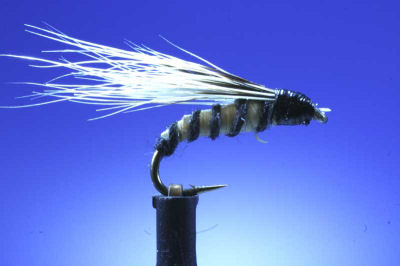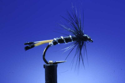 (Binder:Macke - Fabian) Bindfaden 8/0 schwarz Körper: Floss schwarz Rippung: Silbertinsel oval Schwanz: Goldfasan Tippets Hechel: Schwarze Hennenhechel |