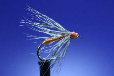 (Binder: Uwe) Materialien: Haken: Trockenfliegenhaken 12 Körper: Bindeseide Orange Rippung: Kupfer fein Hechel: Rebhuhn (Partridge) |