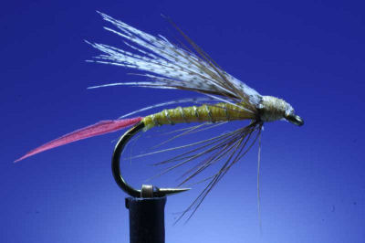 (Binder: Tom Doll) www.fliesandmore.de Materialien: Naßfliegenhaken Gr. 10 – 14 Flügel: Stockente – Mallard Flankenfeder Körper: gelbes Floss Bindfaden: Bindegarn gelb Rippung: Ovaler Goldtinsel / Messingdraht |