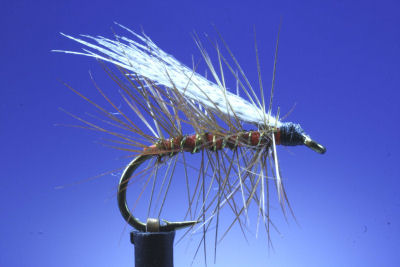 - am Körperende oranges Floss für den Körper und ovales Goldtinsel für die Rippung einbinden - Bindfaden nach vorne führen - Körper aus orangen Floss bilden, Floss einbinden - Hahnenhechel vorne einbinden und zum Körperende hin wickeln (Palmerstil). - Goldtinsel über die Hahnenhechel nach vorne wickeln, um diese festzulegen. - Goldtinsel vorne mit Bindfaden einbinden - Flügel einbinden - Fliege abschliessen Die Fliege stammt aus Nordamerika. Sie kann nass und trocken gefischt