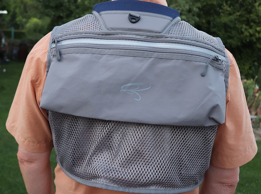 | Wie oben schon erwähnt, stellt die River Trail eine kurze, voll ausgestattete Weste für alle Fälle und Gegebenheiten dar - mit bestem Tragekomfort und über das ganze Angeljahr. Das Mesh-Material nimmt bei Regen höchstens Oberflächenfeuchtigkeit auf und trocknet sehr schnell wieder ab: nasses Wetter stellt -also anders als bei dann schwerer werdender Baumwollwesten- hier absolut kein Problem dar. Mit ihrer gepolsterten Nackenpartie drückt die "voll beladene" Weste nicht nervig im Genick. Für ein gutes Klima und maximal mögliche Belüftung sorgt das Mesh-Material der Weste. Auf einen Frontreißverschluss wurde verzichtet, der kleine Schnappverschluss reicht hier jedoch völig aus. |