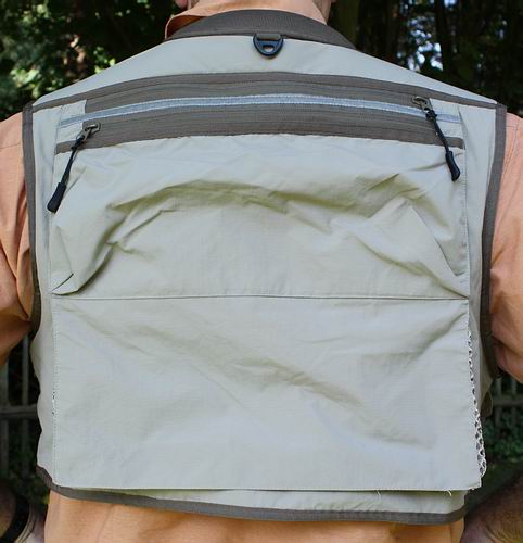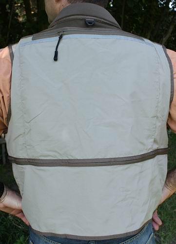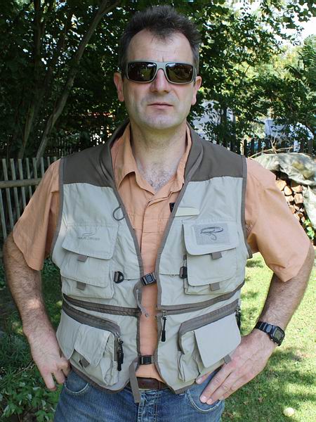 - 2 D-Ringe vorne, 1 D-Ring hinten - 1 Feld für Eigentümer-Kennung innen - reflektierender Sicherheitsstreifen hinten - Aufhänger im Kragen - Zipper zum Abtrennen des unteren, 20 cm breiten Westen-Bereichs - in 5 verschiedenen Größen erhältlich (S, M, L, XL, XXL) - handwaschbar bei 30°C - Preis: 109,50 EUR Testeinschätzung: Einfach unglaublich, welch große Funktionsfülle in diesem leichten Westen steckt! Optisch machen beide Westen einen sehr guten Eindruck, die Verarbeitung ist perfekt und die Passform sowie der angenehme Tragekomfort sind absolut prima! Mehr Taschen wird wohl kein Fliegenfischer brauchen (eher weniger...), auch die Größenvielfalt und die Ausstattung derselben mit Reißverschlüssen bzw. (doppelten) Klettverschlüssen sollte jedes Fischerherz rundherum zufriedenstellen. Alle anderen praktischen Funktionsdetails (siehe Listen oben) wurden unaufdringlich und leicht zugänglich in den Westen untergebracht. Alle Reißverschlüsse lasen sich durch "Zieh-Laschen" komfortabel bedienen und laufen leichtgängig, alle Klappen der Klettverschlusstaschen besitzen zudem fürs bessere Handling kleine Schlaufen. Durch die gepolsterten Kragen- und Schulterpartien drückt die "voll beladene" Weste nicht unnötig (Master Class II). Für gutes Klima und die nötige Belüftung sorgt schließlich das Netzfutter in beiden Westen. |