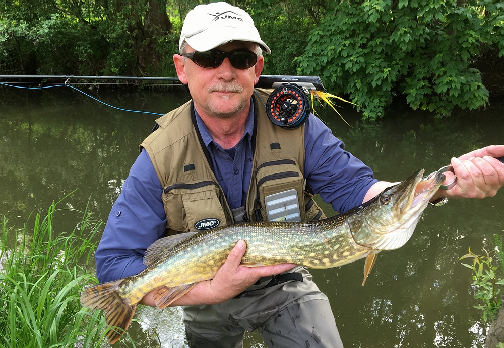 (B-07) | "Tatort Ilm: Stefan mit Hecht aus dem Forellenflüsschen. Dieser Räuber frisst nun keine Bachforellen mehr... (spuckte aber im Drill noch eine aus!)" | Foto & Copyright: Michael Müller