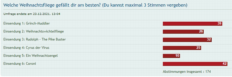- die Ausschreibung & Ausstellung: (im Board / hier Klicken) - die Abstimmung: (im Board / hier Klicken) - und hier sind die Weihnachtsfliegenberichte der letzten 12 Jahre: - 2020: (hier Klicken) - 2019: (hier Klicken) - 2018: (hier Klicken) - 2017: (hier Klicken) - 2016: (hier Klicken) - 2015: (hier Klicken) - 2014: (hier Klicken) - 2013: (hier Klicken) - 2012: (hier Klicken) - 2011: (hier Klicken) - 2010: (hier Klicken) - 2009: (hier Klicken) |